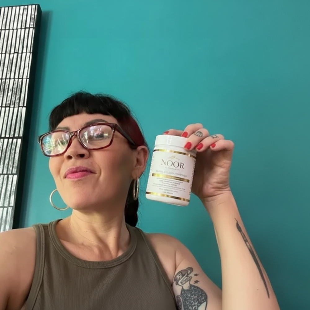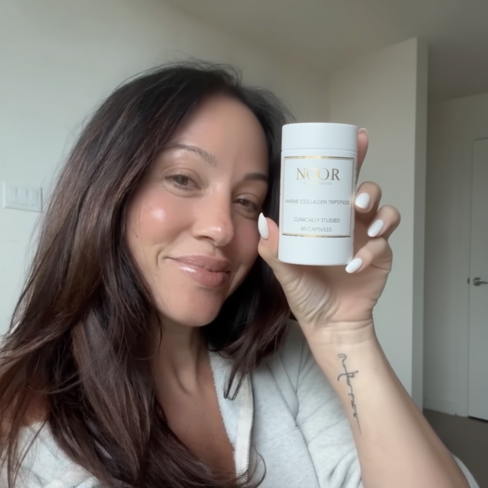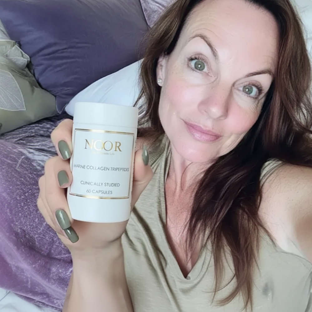 Put simply, Noor contains marine collagen tripeptides—the smallest, most absorbable form of collagen available—in a clinically proven 2g dose. Perfectly portioned and easy to take, you get your daily collagen in just two capsules—no mess, no fishy taste, no mixing required. Our marine collagen tripeptides are specifically formulated for women in menopause and beyond, designed to absorb 3x better than standard collagen, even when digestion slows down. Noor has been clinically tested to reduce wrinkles, improve hydration and elasticity, strengthen hair and nails, and support joint mobility and bone density—all in just 12 weeks.